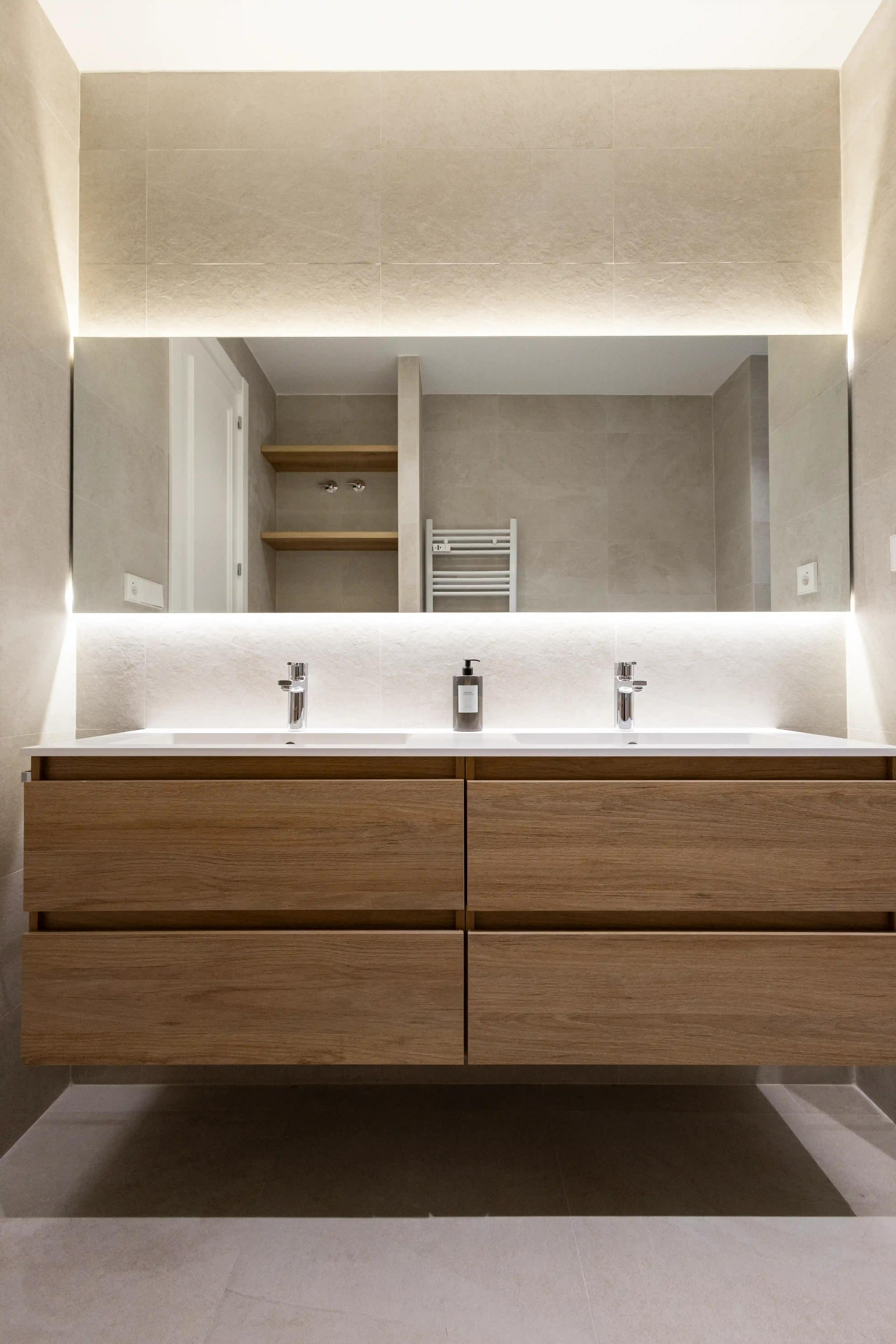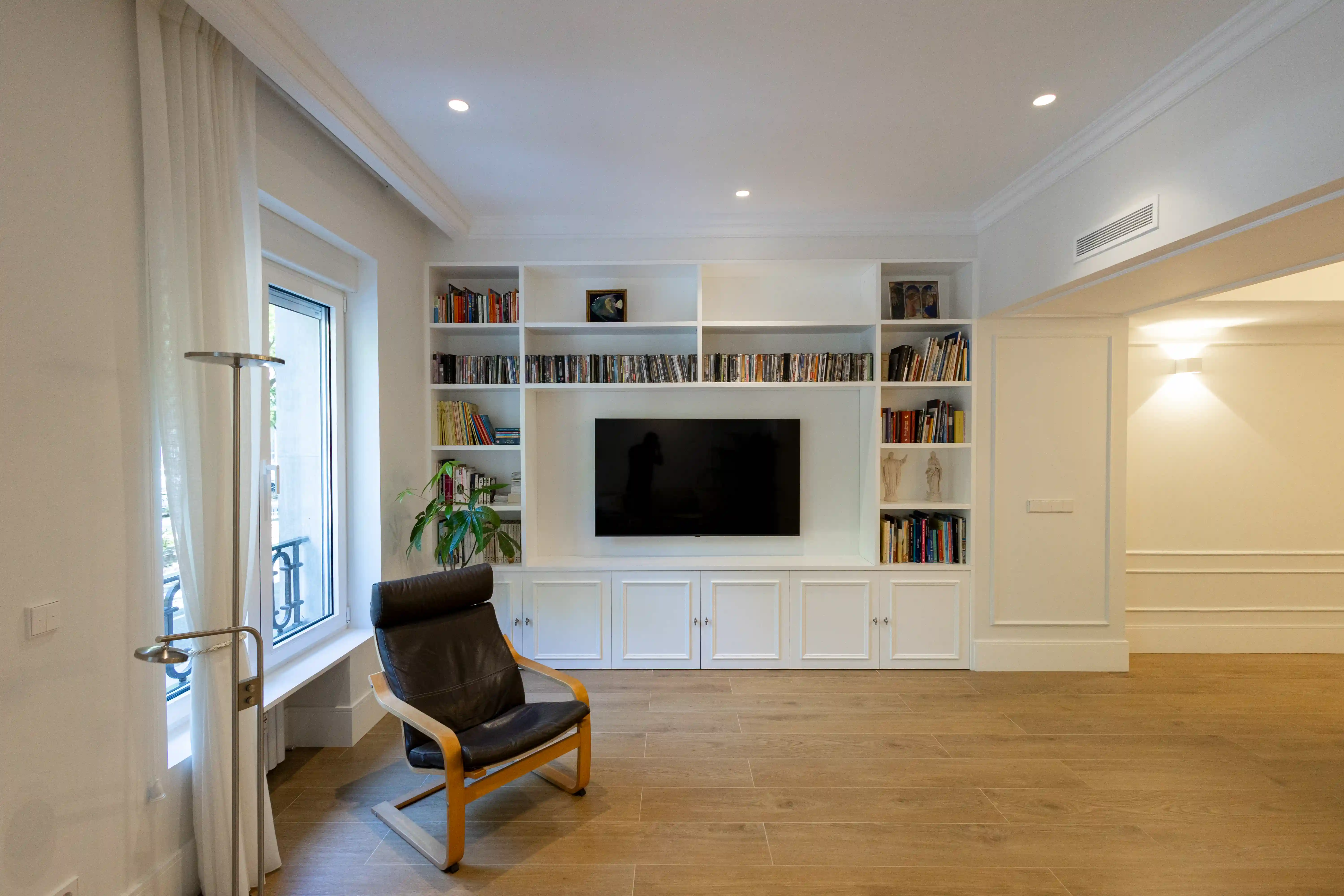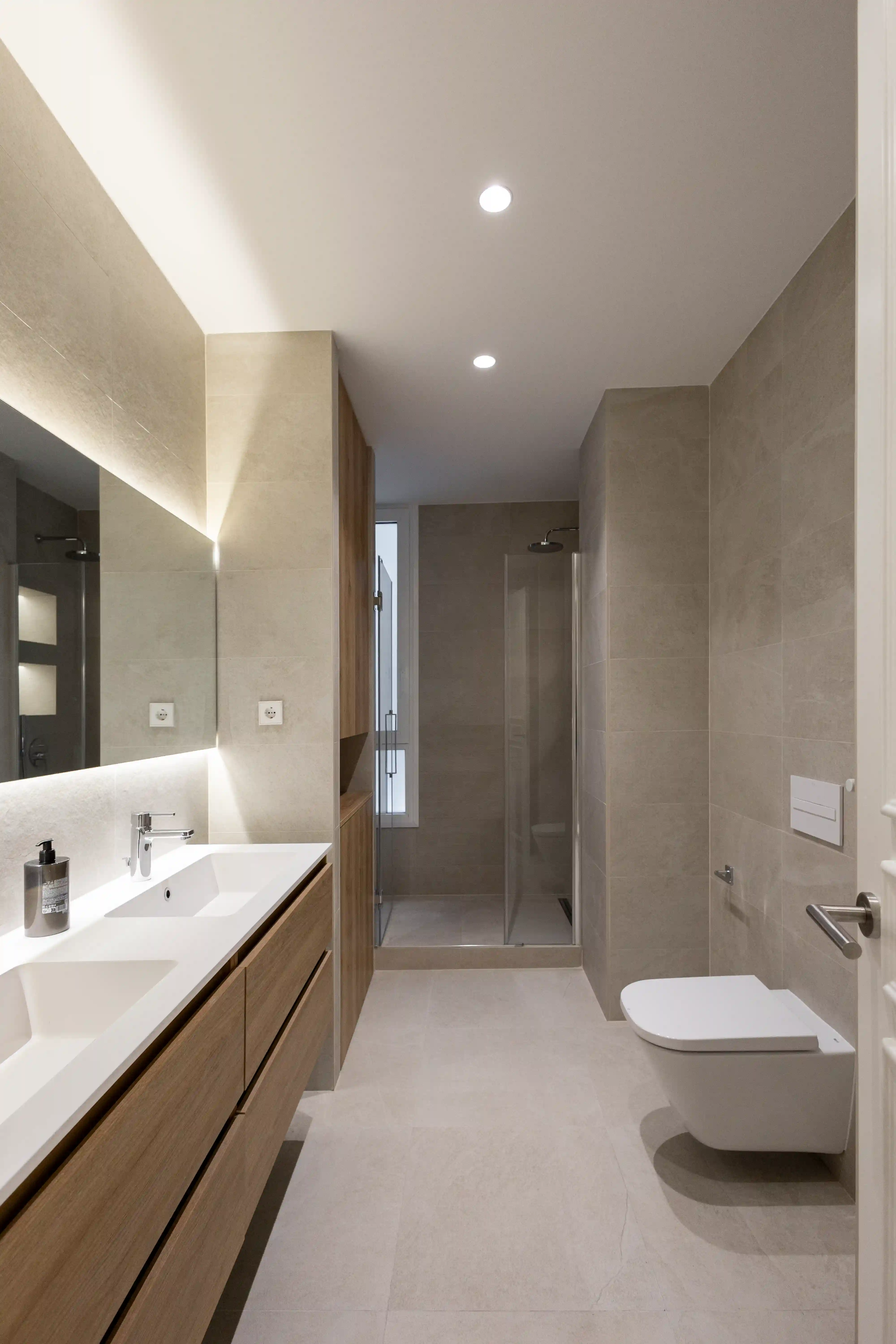 Las habitaciones presentan un lenguaje clásico renovado con puertas especiales, carpintería a medida y acabados claros que optimizan luz y sensación de amplitud. Los dos baños completos incorporan revestimientos sobrios y elementos contemporáneos, creando una atmósfera elegante y funcional. Este proyecto ejemplifica la reinterpretación de un apartamento clásico de Madrid: preserva su carácter histórico, potencia la altura y luz natural, e integra elementos contemporáneos que adaptan la vivienda a las necesidades actuales.